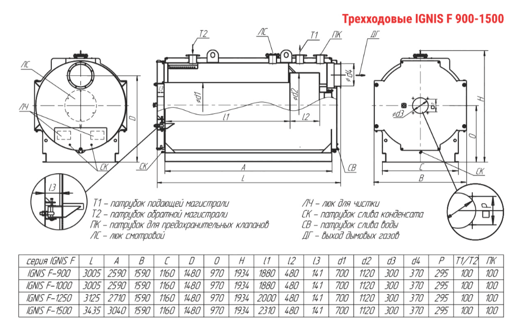 Технические характеристики водогрейного трёхходового котла ARCUS IGNIS F-1250
